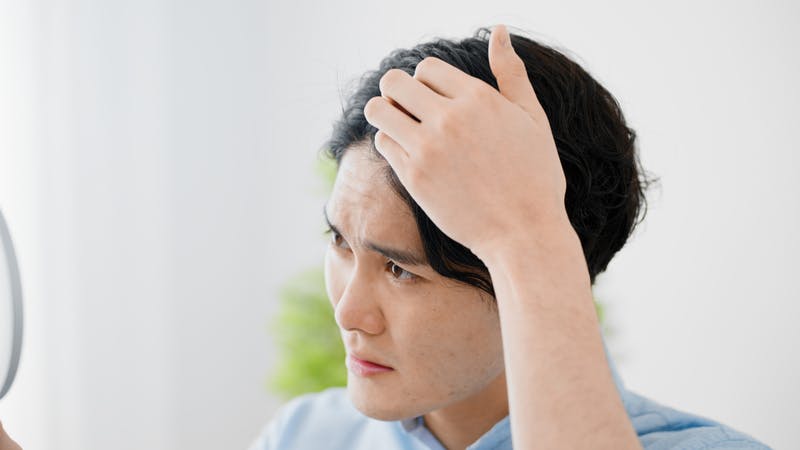 鏡やスマホのカメラを使って頭頂部の分け目やつむじを確認したり、髪の束を指で持ち上げたりしてみましょう。つむじ周辺の頭皮が透けて見える場合や、側頭部など他の部位と毛髪の太さや密度、色の濃さなどに違いが見られる場合、O字ハゲの初期症状が疑われます。