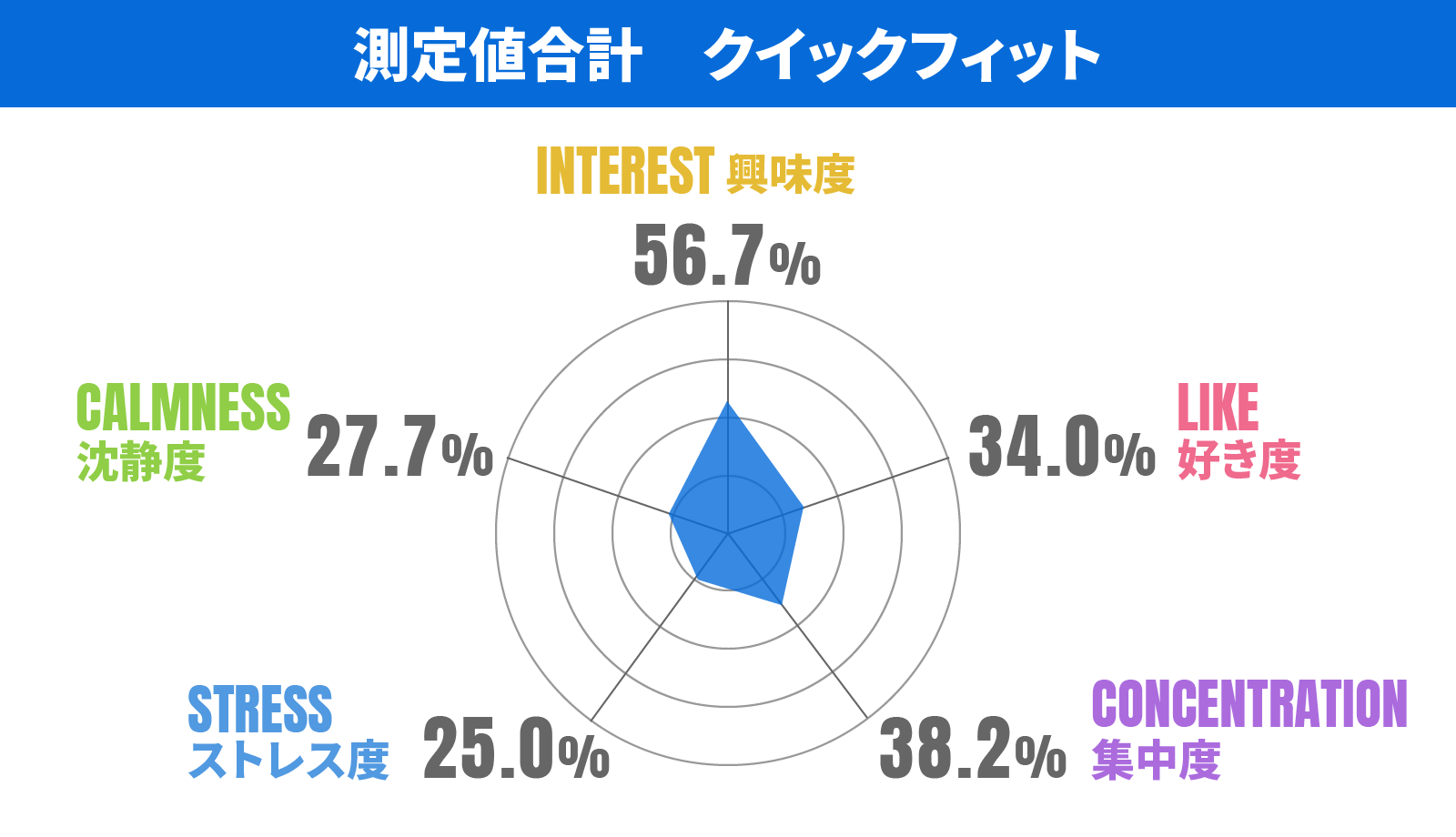 2つを比較すると、スヴェンソン式増毛法装着時は好き度が高く、 クイックフィット装着時は集中度が上がっています。前者は、製品が外れない安心感からくるポジティブな気持ちで、後者は製品が外れてしまうのではという不 安で、頭に意識が集中している状態であると考えられ ます。