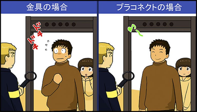 海外に新婚旅行に行く場合、金具ですと 「ブー」っと鳴ることは国の情勢による金属探知機のレベルによりますが、『ドキドキ』してしまいます。一方、樹脂製(プラコネクト)ですと、樹脂製ですので金属探知機に反応しませんので、その不安を払拭できます。