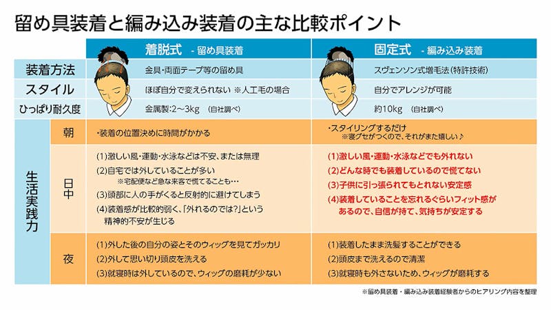 やくみつるさん曰く「寝ぐせがつくので、それがまた嬉しい♪」と愛用者のやくみつるさんも共感する 「着脱式留め具装着 vs 固定式編み込み装着」の比較表でもご確認ください!増毛相談をする際に お役にたてますと嬉しいです。